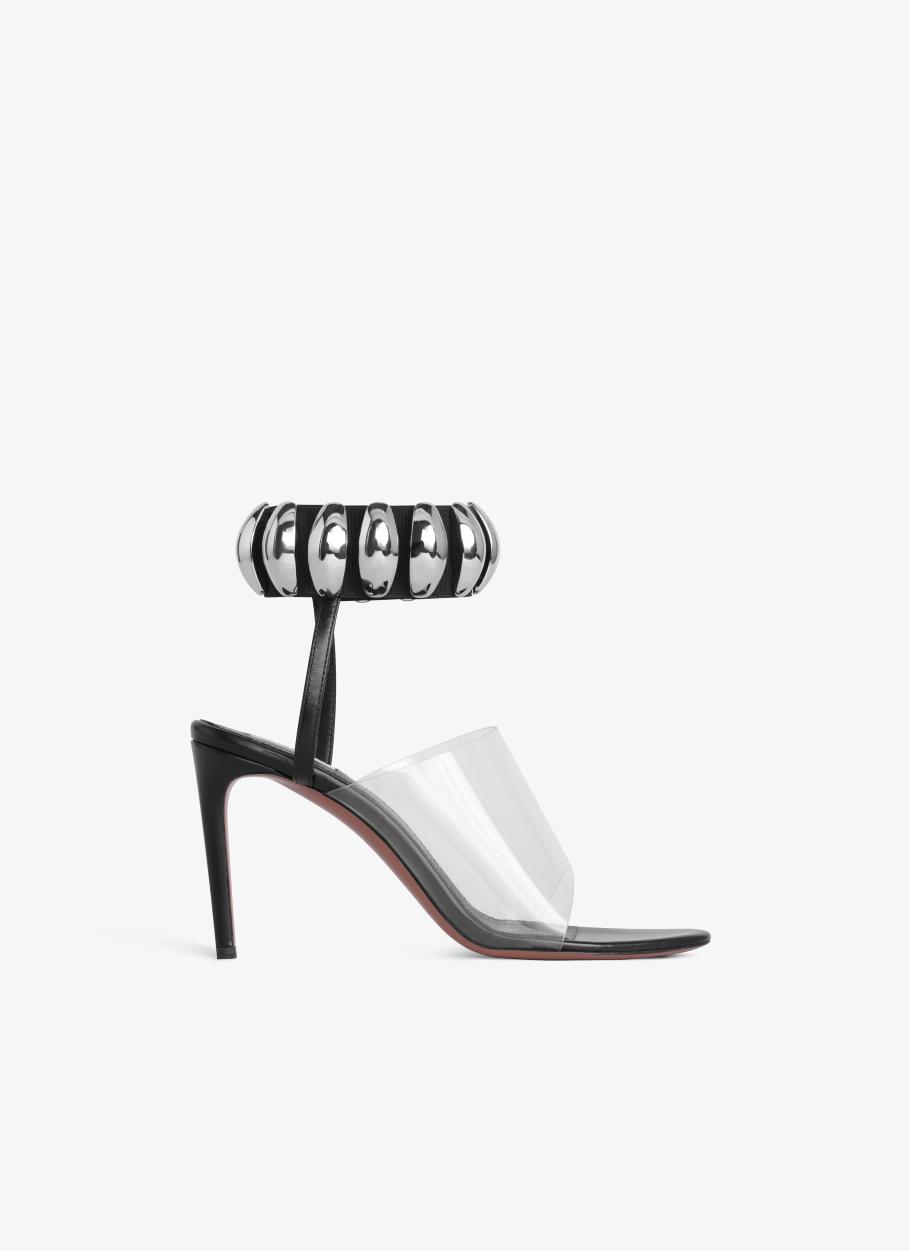 sophisticated sandals adorned with metallic pebbles around the ankle