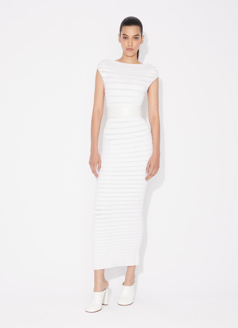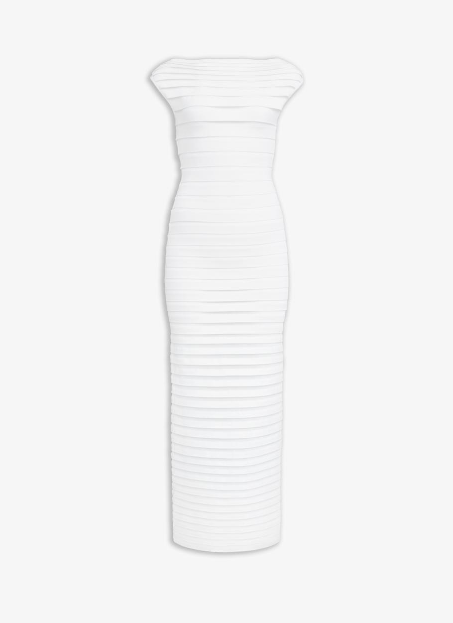 Discover the exquisite tube scallops dress featuring a striking straight graphic neckline and cap sleeves