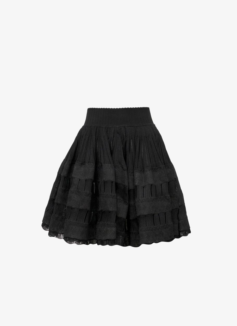 Elevate your style with this high-waisted mini-skirt featuring a ribbed waist that dramatically expands into a full volume silhouette; expertly knitted in luxurious high-shine viscose lace stitches for exceptional movement and shine.