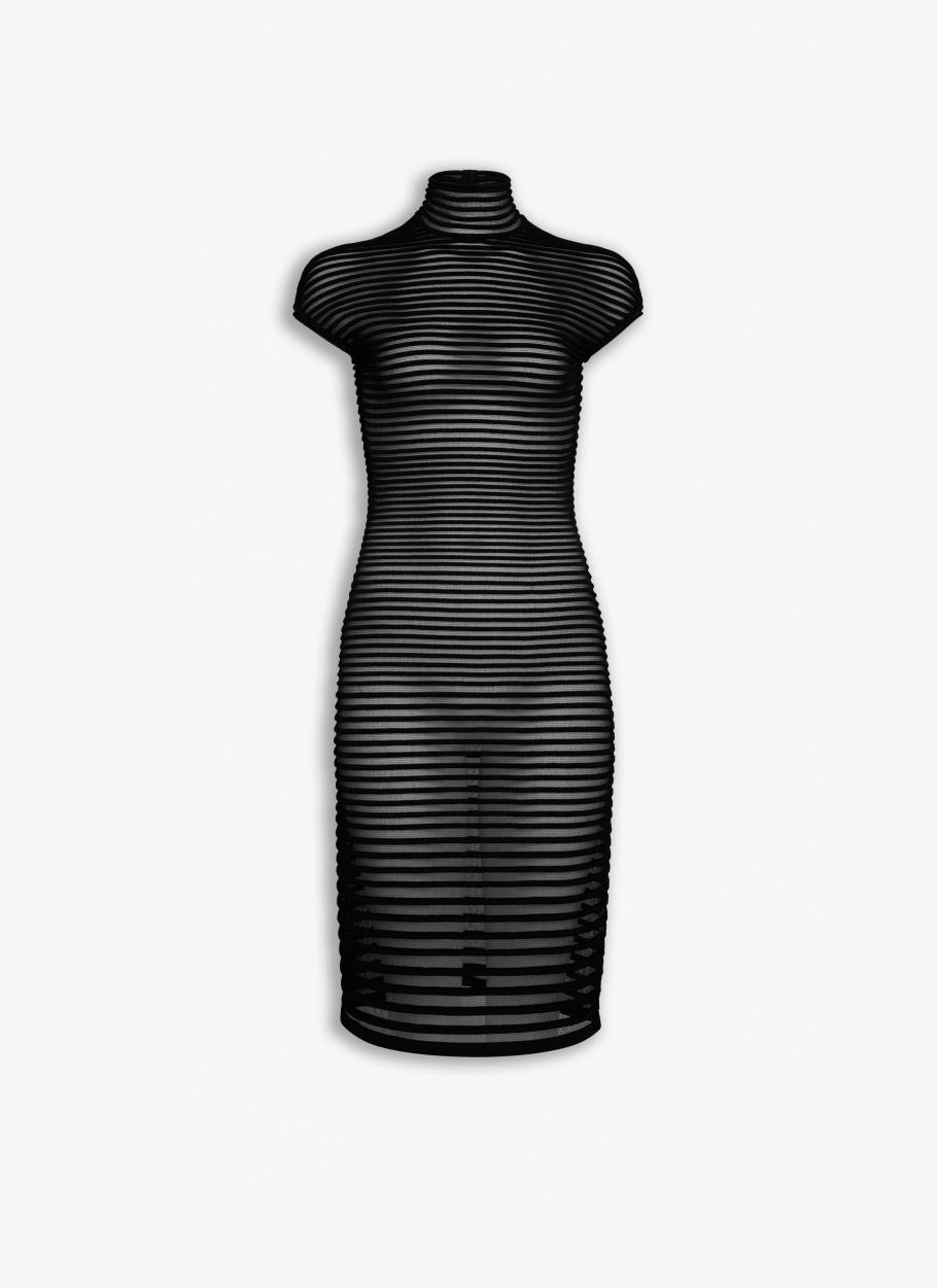 Elevate your wardrobe with this striking striped dress featuring a sophisticated high neckline and sleeveless design